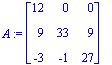 > A:=matrix([[12, 0, 0], [9, 33, 9], [-3, -1, 27]]);