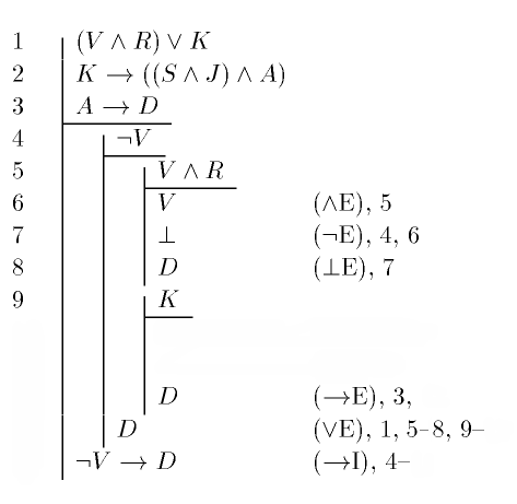 Notice we add the justifications and line numbers as we go along, as best we can (catching up once we know how many lines are being used). This saves us having to do it all at the end - you know what rule you are using as you use it, but may forget that fact later on.